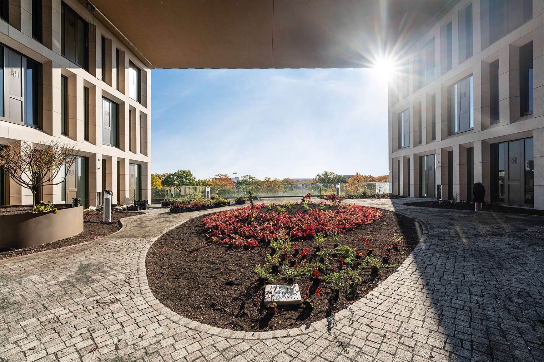 Neben gestalterischen Highlights wie einer Ortbetontreppe, einer 102 m² großen Pflanzenwand und filigranen Holzlamellen überzeugt das Gebäude durch nachhaltige Bauweise und BNB-Silber-Zertifizierung. Zwei begrünte Innenhöfe sowie flexible Arbeitsplatzkonzepte unterstreichen den Anspruch an New Work und Wohlbefinden. Dank Lean-Management konnte das komplexe Projekt termingerecht fertiggestellt werden.