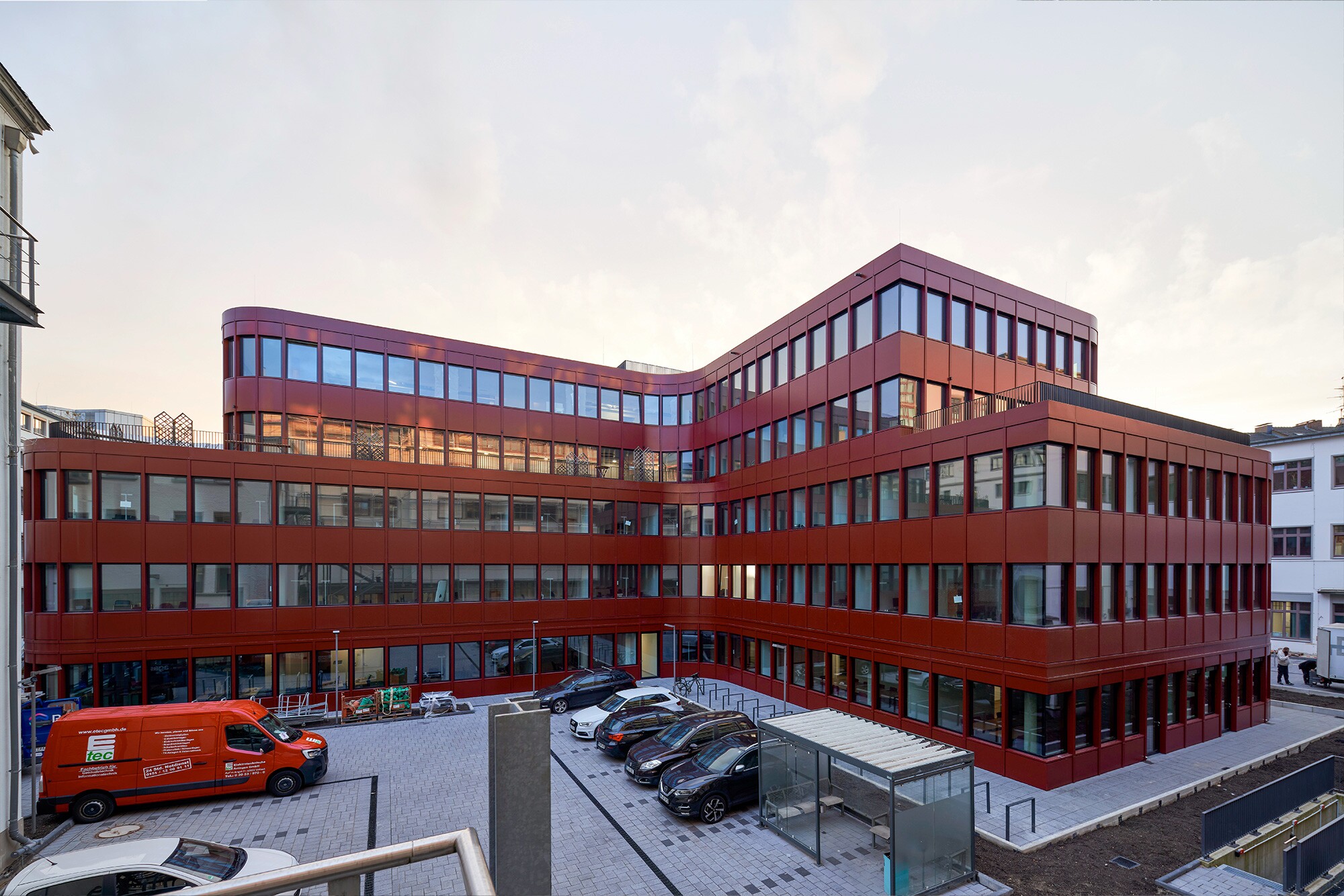 Der Büroneubau CURVE schließt das rund 4.136 m² große Baufeld zwischen Helmholtz-, Luisen- und Scheurenstraße in unmittelbarer Nähe des Düsseldorfer Hauptbahnhofs. Mit seiner markant geschwungenen, leuchtend roten Fassade hebt sich das Gebäude deutlich von der umliegenden Bebauung ab. Der dynamische, kreuzförmige Grundriss ermöglicht eine Erweiterung des Baukörpers in den Blockinnenbereich. Auf sechs Geschossen entstanden moderne, flexibel nutzbare Büroflächen mit insgesamt 10.800 m².
