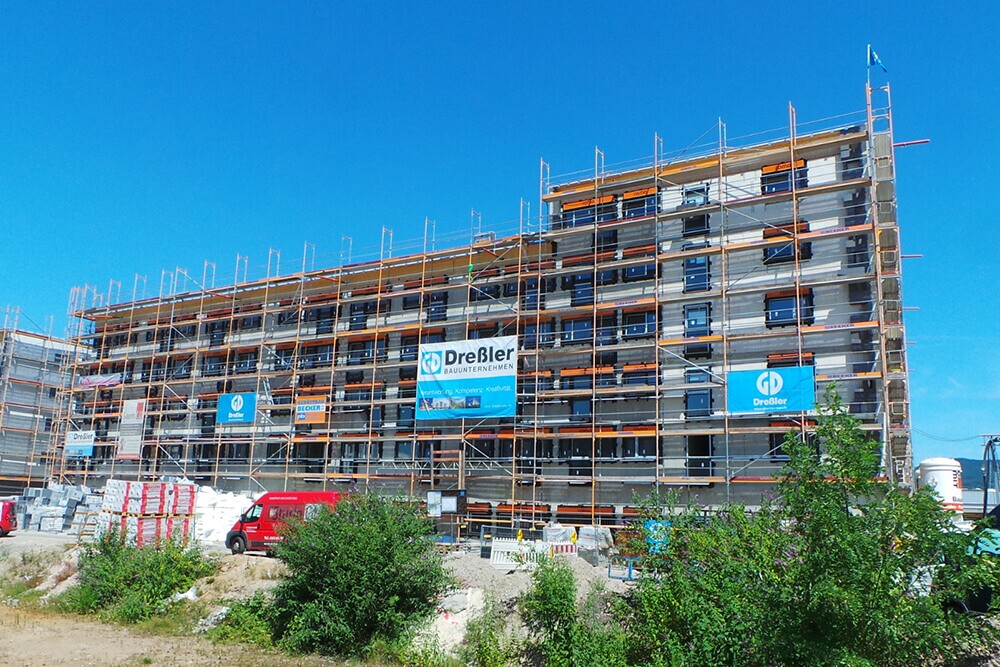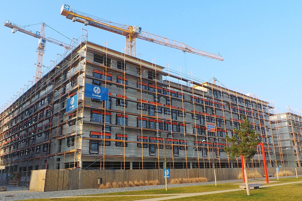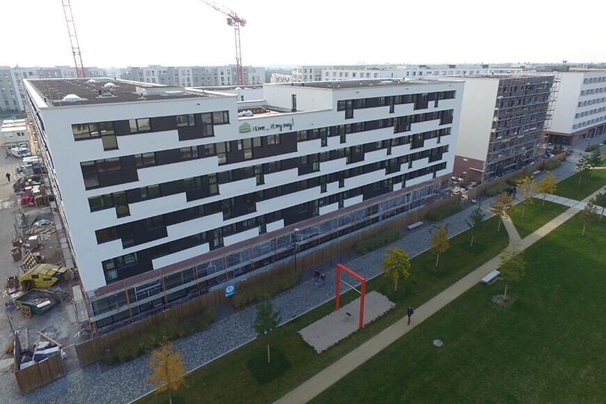 In Europas größter Passivhaussiedlung, dem Stadtteil Bahnstadt in Heidelberg, haben wir auf einer Fläche von 5.410 m² ein Gebäude mit insgesamt 370 Appartements für studentisches und temporäres Wohnen in Passiv[-]hausbauweise mit 5 bis 6 Obergeschossen auf einer Tiefgarage mit 117 Stellplätzen errichtet.