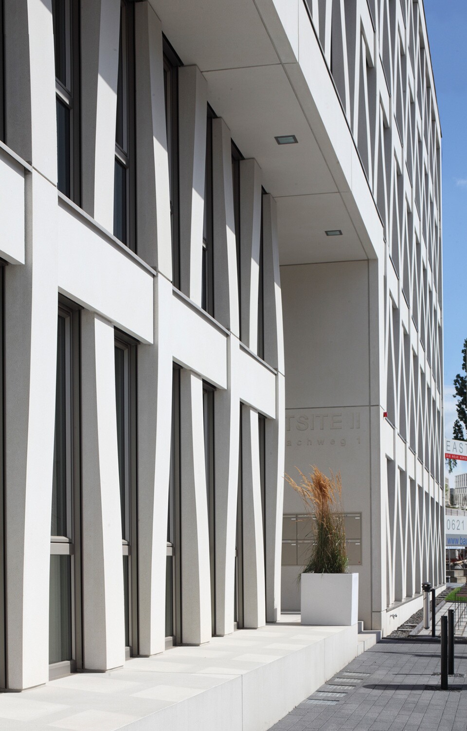Das markante Erscheinungsbild des 5-geschossigen Bürogebäudes wird durch die wie ein Flechtwerk wirkende Sandwichfassade geprägt. Die Sandwichelemente bestehen aus der Tragschale, der Wärmedämmung und der Vorsatzschale und haben zum Teil eine Größe von 3,29 m Höhe, 5,58 m Breite und 0,52 m Dicke. Die Sockel sind einschalig und zum Teil als Winkel ausgebildet. Mit der individuell für Eastsite II entwickelten Architekturbetonmischung und den gesäuerten Oberflächen bekommt das Gebäude den vom Bauherrn und Architekten gewünschten einmaligen Charakter.