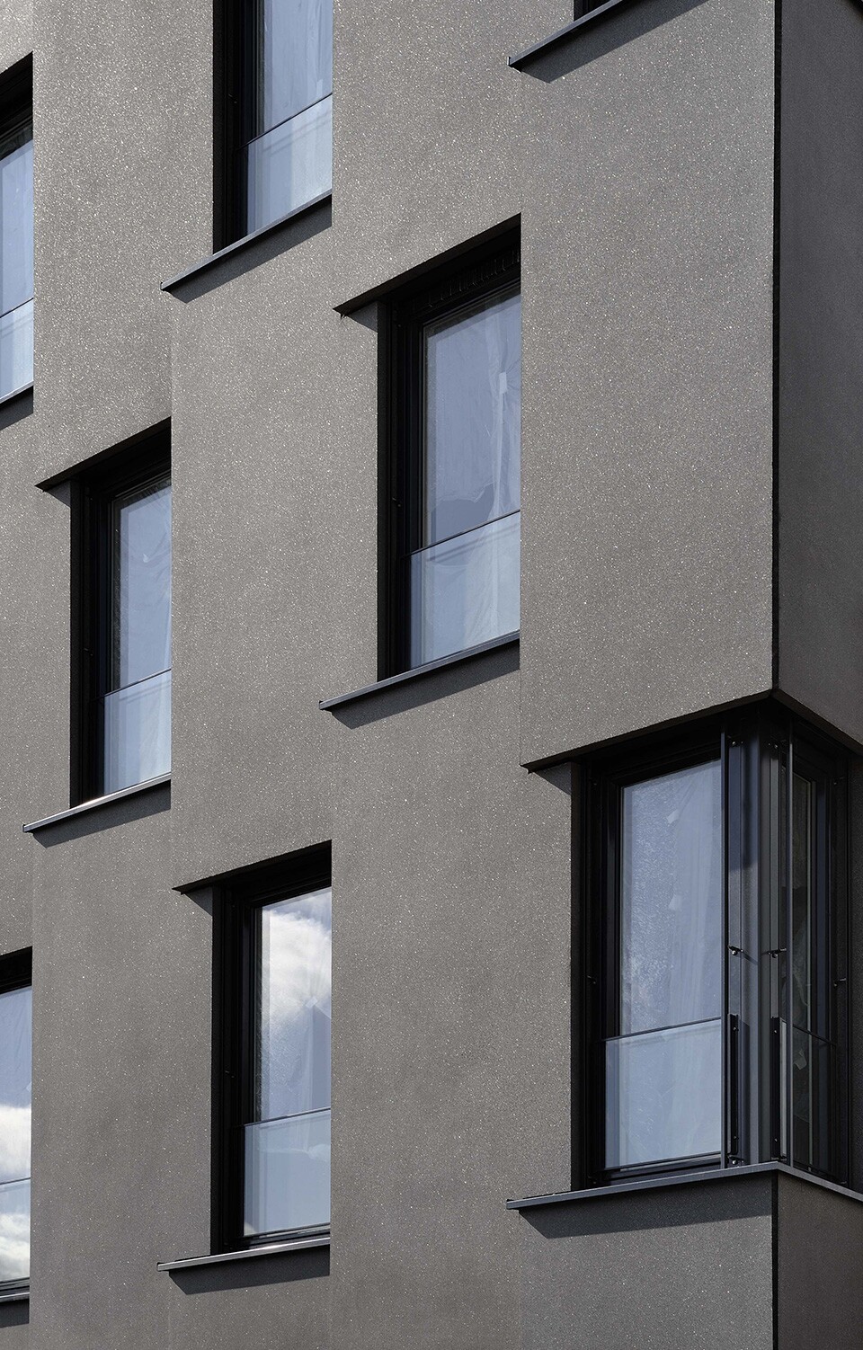 Im Januar 2008 stellte uns das Architekturbüro Fischer einen auffälligen und außergewöhnlichen Fassadenentwurf vor. Der Entwurf zeigte Betonfertigteile aus Sandwichelementen mit einer hohen Wiederholungszahl, die in der Fassadenfläche schräg angeordnet und jeweils um ein Element in dem darüberliegenden Geschoss versetzt werden. Nachdem durch den Bau von Modellen die Machbarkeit möglich erschien, erstellten wir den rechnerischen Nachweis. Zur Ausführung kamen 220 Sandwichelemente und 84 vorgehängte Wandelemente. Die Größe der Elemente liegt bei einer Breite von 1,65 m, einer Höhe von 4,12 m und einer Dicke von 0,38 m bzw. 18 cm. Die Oberfläche der Architekturbetonelemente ist gesäuert.