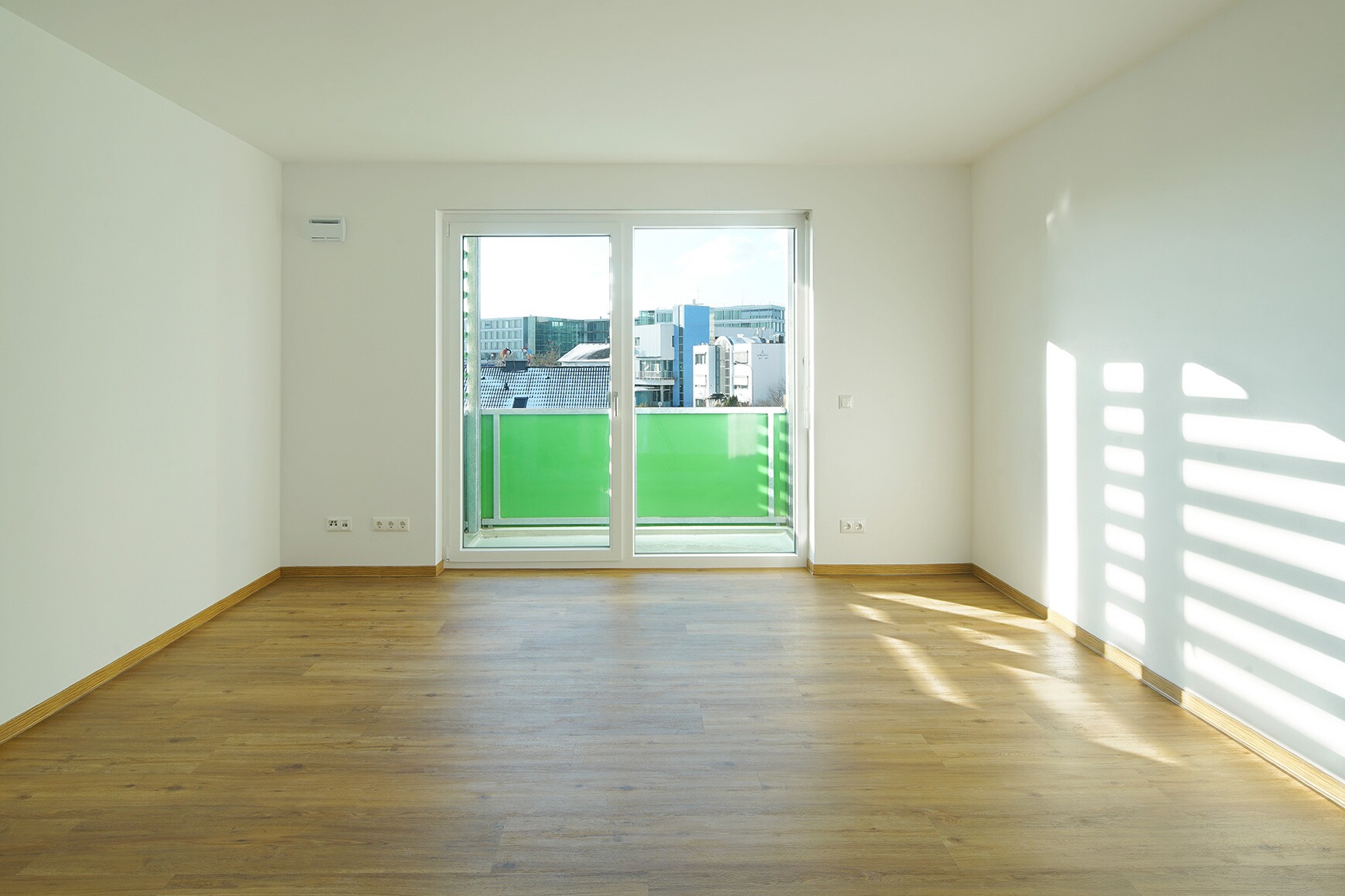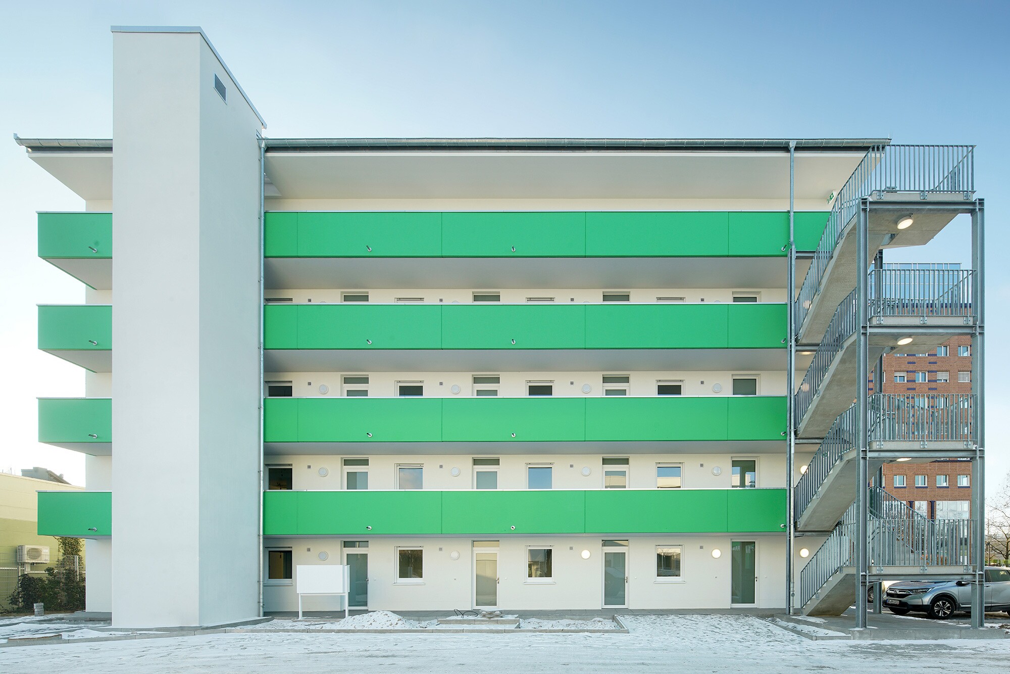 Aufgrund der Nähe zur Bahntrasse und der Lage in einem Gewerbegebiet waren erhöhte Schallschutzanforderungen an Fenstern und Nachströmöffnungen zu realisieren.