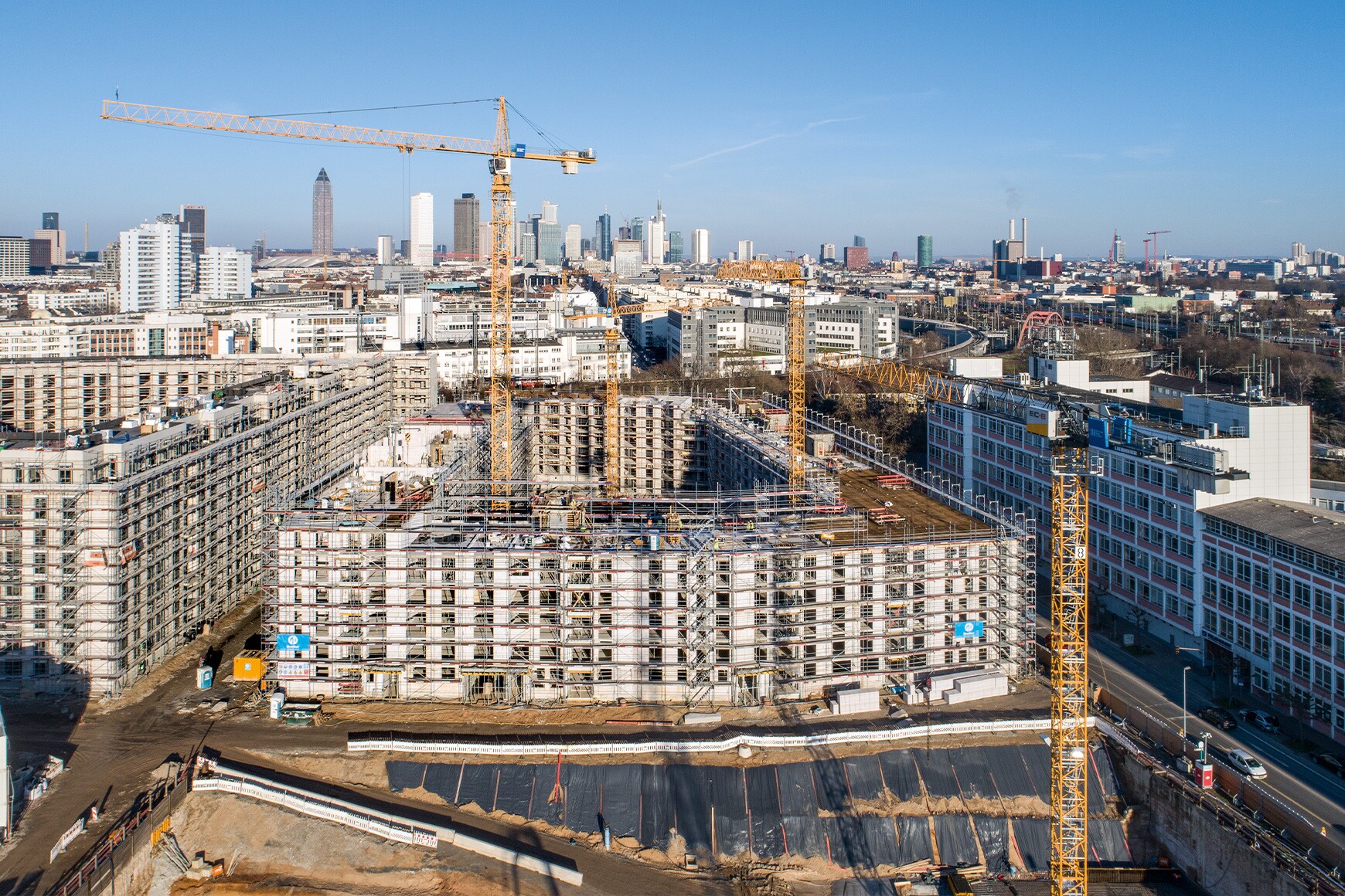 Das Projekt „Franky“ in Frankfurt, entwickelt auf dem ehemaligen Avaya- Gelände an der Kleyerstraße, bietet modernen Wohnraum für über 1.300 Haushalte und entlastet den lokalen Wohnungsmarkt. Dreßler Bau ist für den Rohbau des Bauabschnittes WA6 verantwortlich, der 319 Mietwohnungen mit 13 Treppenhäusern sowie eine zweigeschossige Tiefgarage mit 284 Stellplätzen und angrenzenden Kellerräumen umfasst. Die herausfordernde Bauzeit von nur 14 Monaten erforderte eine deutschlandweite Logistik mit Schwertransporterfahrten, um Betonfertigteile wie Balkone und Treppenläufe pünktlich zu liefern. Die Anlage folgt einem Blockstruktur- Design mit 7 Obergeschossen, wobei ein 4-geschossiger Abschnitt mehr Licht und Luftzirkulation im begrünten Innenhof fördert.