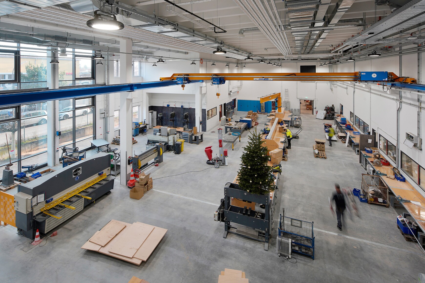 Im Erdgeschoss entstanden Büro- und Sanitärbereiche sowie eine mechanische Werkstatt mit Krananlage, die für Metallbearbeitung und Reparaturen sowie als Ausbildungsstätte genutzt wird. Ergänzend wird ein Ersatzteillager mit Lagerliftsystemen realisiert, die bis zur UK-Decke des 2. Obergeschosses reichen. Weitere Funktionsräume wie Öllager, Waschplatz, Staplerwerkstatt, Technische Rettung und ein Malerraum sind ebenfalls integriert. Das 1. Obergeschoss dient der Unterbringung technischer Anlagen sowie zusätzlicher Lager- und Archivflächen. Im 2. Obergeschoss entstehen Büro-, Konferenz-, Sanitär-, Umkleide- und Aufenthaltsräume.