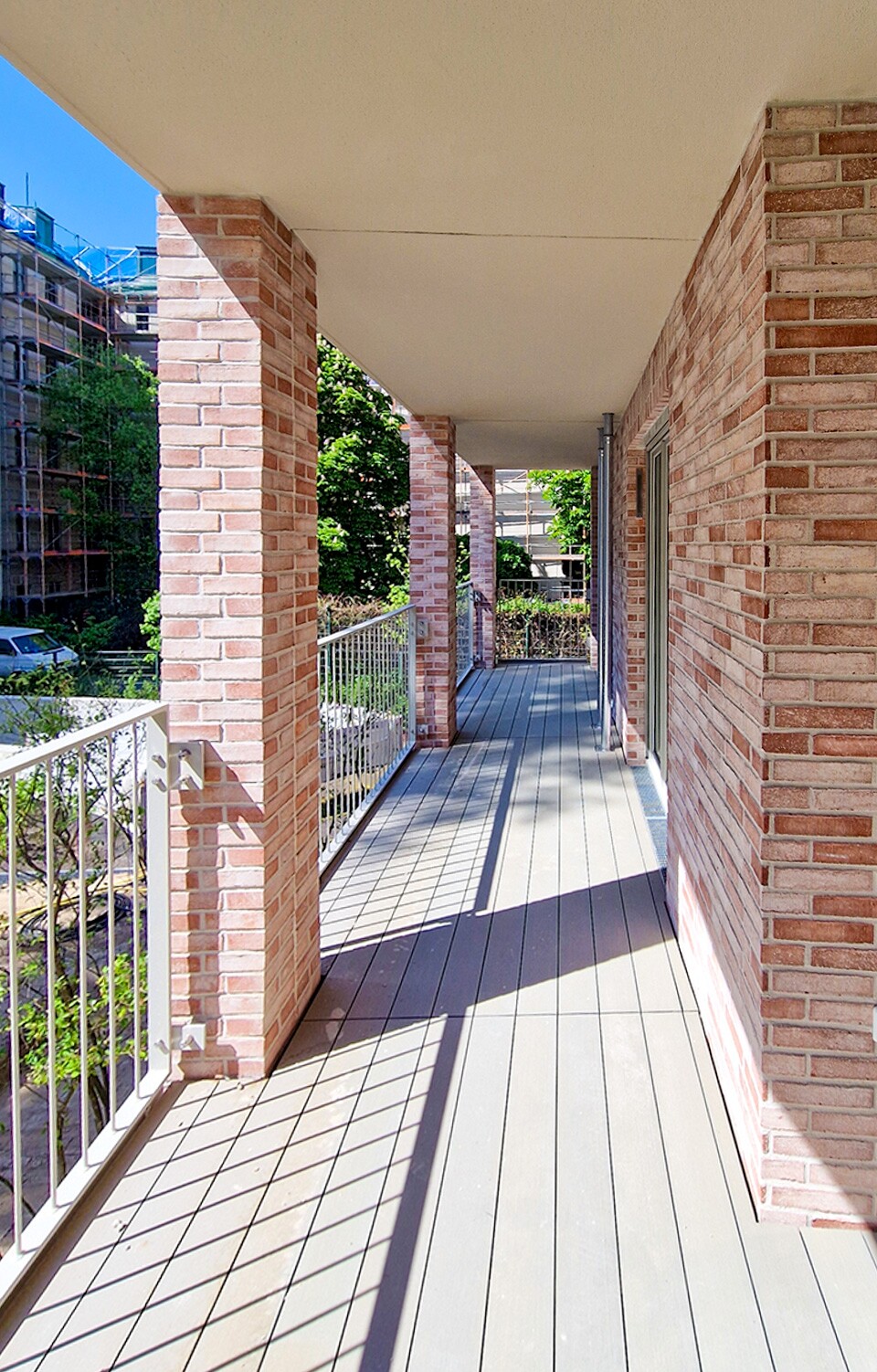 Im belebten Berliner Stadtteil Kreuzberg schließt das Hofgartenhaus eine Baulücke im historischen Bergmannkiez. Das 7-geschossige Gebäude mit 28 Wohneinheiten verbindet moderne Eleganz mit den historischen Einflüssen der Umgebung, speziell der angrenzenden Gebäude aus dem 19. Jahrhundert. Die hochwertige Fassade mit Wasserstrich-Klinkerriemchen und bodentiefen Fenstern, ergänzt durch edle Materialien wie Jura-Marmor und Marazzi-Fliesen im Innenbereich, verleiht dem Neubau seinen einzigartigen Charme. Jede Wohnung bietet zudem Außenbereiche wie Balkone oder Dachterrassen, und eine Solarthermie-Anlage sorgt für nachhaltige Warmwasserbereitung.