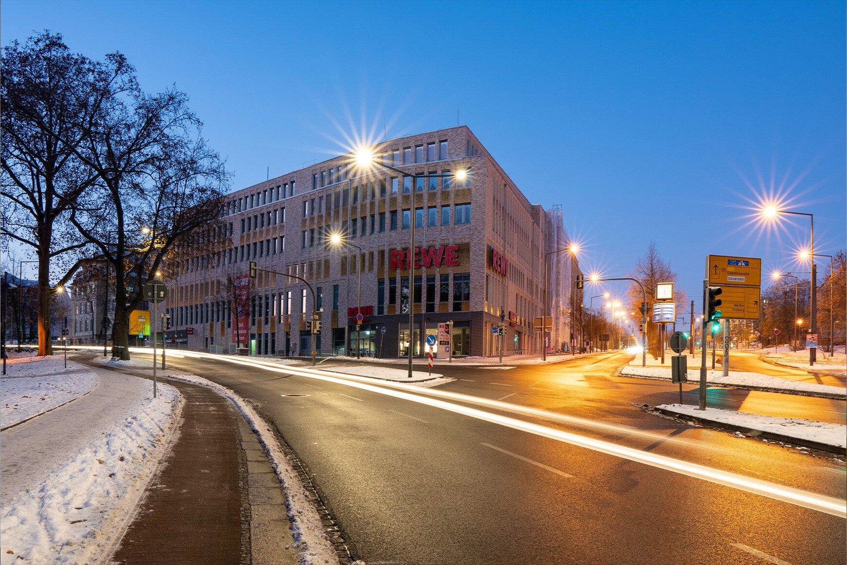 Im Erdgeschoss wird ein REWE-Markt mit einer Fläche von 5.500 m² errichtet. In den Geschossen oberhalb der Einkaufsbereiche werden zukünftig 24.118 m² von der TU Dresden als Unterrichts- und Büroräume genutzt werden. Die zwei Untergeschosse sind vorranging als Tiefgarage mit insgesamt 144 Stellplätzen sowie zur Unterbringung der Gebäudetechnik und für Lagerflächen geplant. Im 1.OG entsteht noch ein Parkdeck als offene Großgarage mit 95 Stellplätzen. Das Parkdeck wird intensiv begrünt.