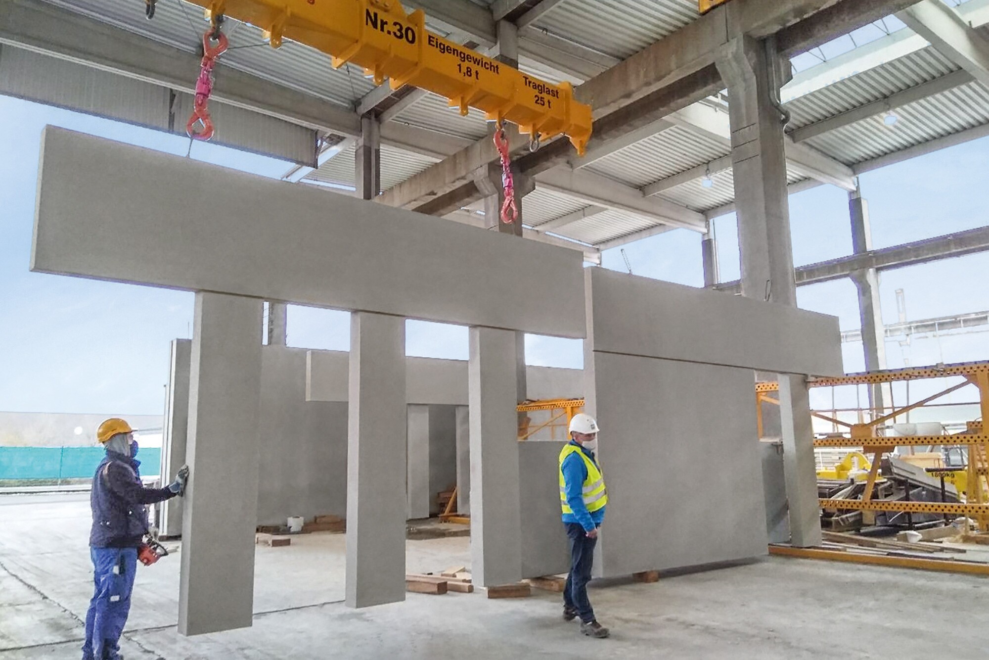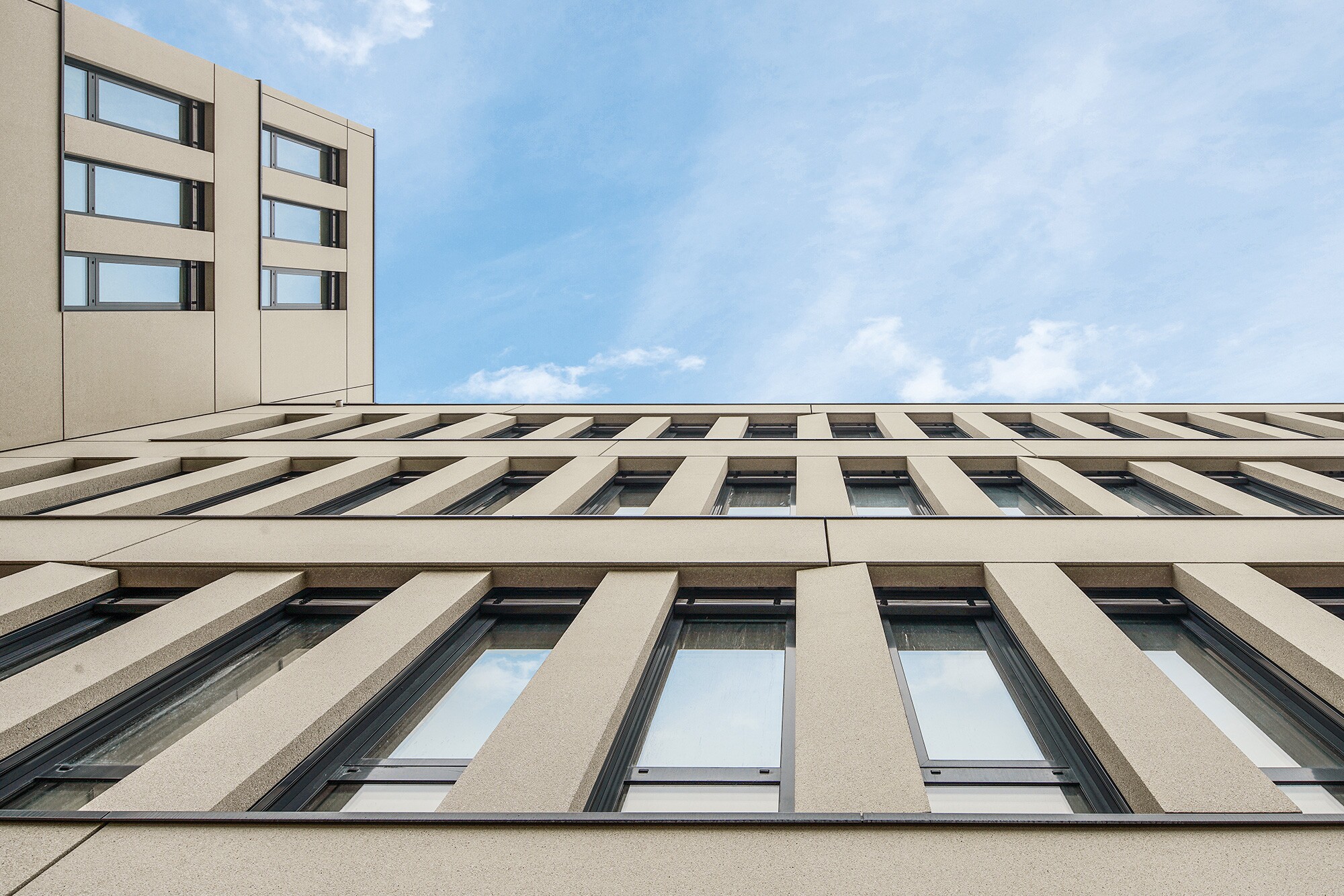 Im Rahmen des Bauvorhabens Hofmark BF1 erhielten wir den Auftrag zur Erstellung der Fassade aus Architekturbeton. Um die Gebäudehülle mit ihrer beigen Farbgebung und den geradlinigen und zeitlosen Formen entwurfsgemäß zu erzielen, hieß es, die Elementstatik einschl. Schal- und Bewehrungsplänen zu entwickeln – und letztlich 361 Betonfertigteile inkl. Dämmung in unserem Werk in Stockstadt a. Main herzustellen und in München zu montieren. Die Gesamtfassade des Gebäudes besteht aus Fassadenelementen, die zum größten Teil als 2- und 3-stielige Kämme ausgebildet sind. Die Oberflächen wurden fein gewaschen. Dies verleiht den Elementen eine sehr hochwertige Anmutung. Die Lochfassade erstreckt sich über 4 Obergeschosse und hat eine feine Wellenstruktur erhalten.