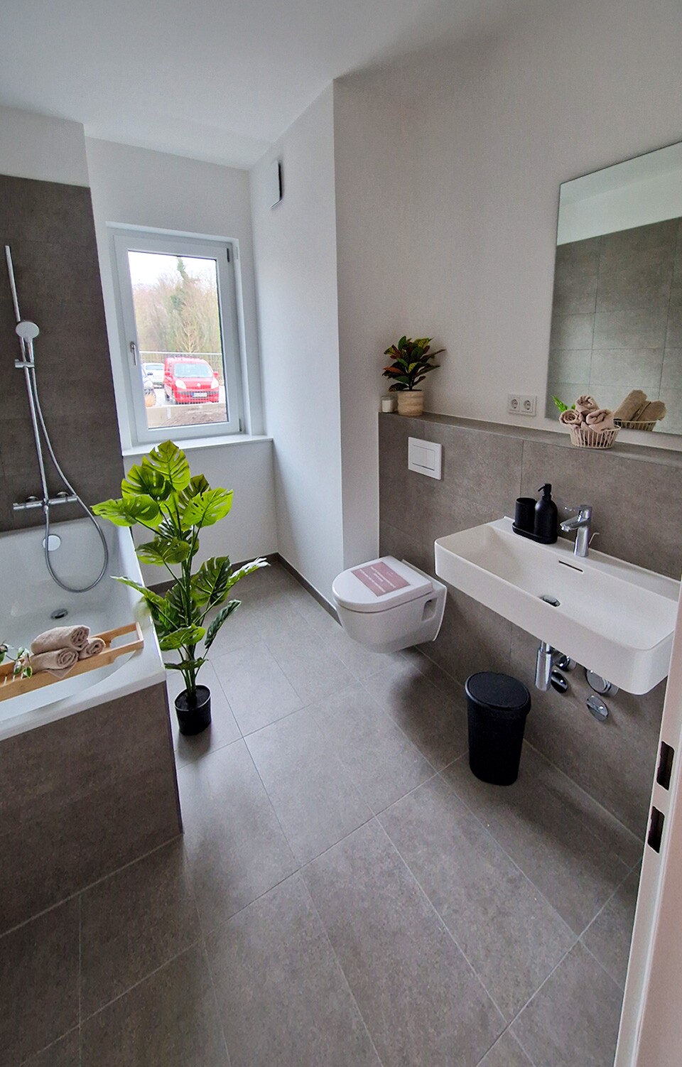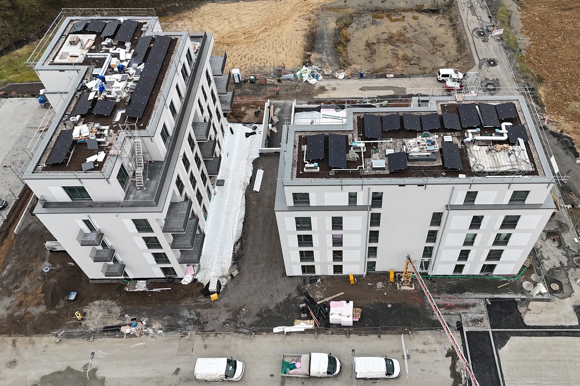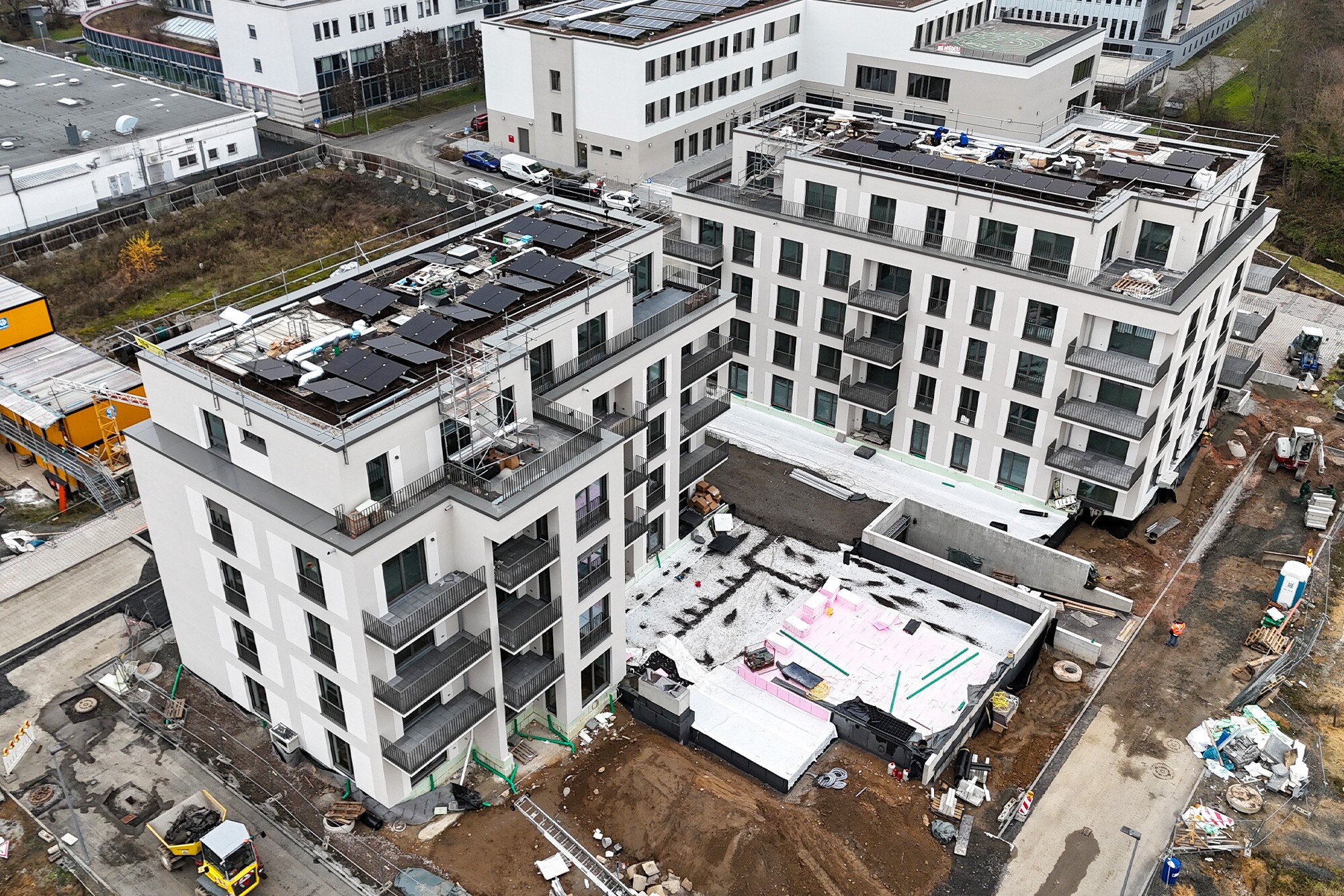 Auf dem ehemaligen Gelände der Hessenglasfabrik AG in Oberursel entsteht ein neues Wohn- und Gewerbequartier. Die Niederlassung Aschaffenburg errichtet dort bis Ende März 2026 zwei Wohngebäude mit je 18 Wohnungen in fünf Geschossen, verbunden durch eine gemeinsame Tiefgarage. In „Haus A“ entstehen 16 geförderte Wohnungen sowie zwei Eigentumswohnungen im Staffelgeschoss. Alle 18 Wohnungen in „Haus B“ sind Eigentumswohnungen, teilweise bereits während der Bauzeit verkauft. Die Grundrisse umfassen 2- bis 4-Zimmer-Wohnungen, teils mit zwei Bädern. Beide Gebäude werden im KfW‑55‑Standard mit Photovoltaikanlage ausgeführt. Die BGF liegt bei ca. 6.180 m²; die Wohnfläche bei ca. 2.130 m². Die Fassaden entstehen als WDVS-Konstruktion mit 3-fach-verglasten Kunststofffenstern. Die Belüftung erfolgt über Rollladen- bzw. Leibungslüfter, die Abluft über feuchtegesteuerte Elemente in Bädern und Küchen. Die Beheizung übernehmen Dachwärmepumpen, das Warmwasser wird zusätzlich über Booster-Wärmepumpen im Keller erhitzt. Alle haustechnischen Anlagen sind vollständig getrennt und auf die spätere Realteilung vorbereitet. Die gemeinsame Tiefgarage mit 35 Stellplätzen wurde in WU-Beton ausgeführt. Die nicht überbaute Garagendecke wird nach dem Schwammstadtprinzip als Retentionsfläche gestaltet, die Entwässerung erfolgt direkt in den Urselbach.
