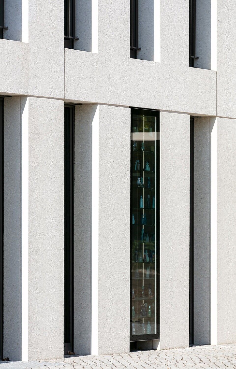 In direkter Nachbarschaft zum historischen Gebäudeensemble des Polizeipräsidiums steht der 6-stöckige quaderförmige Neubau des Karlsruher Finanzamtes. Mit seinem klar strukturierten, rhythmisierten Fassadenraster schufen Wittfoht Architekten einen in sich ruhenden Stadtbaustein. Seine plastische Profilierung erhält das Bauwerk durch die 38 cm tiefen Laibungen. Die Vorsatzschale der Sandwichelemente mit ihrer weißen, gestrahlten Oberfläche ist mit Glasfaserbewehrungsstäben an der Tragschale befestigt. Mit der thermisch nichtleitenden Verankerung und der 30 cm dicken Dämmung ist die Architekturbetonfassade mit einem Wärmedurchgangskoeffizienten von U ≤ 0,14 W/m²K auch für die Zukunft gut ausgerüstet. Mehr als 260 geschosshohe Sandwichstützen und -wände kamen zur Ausführung.