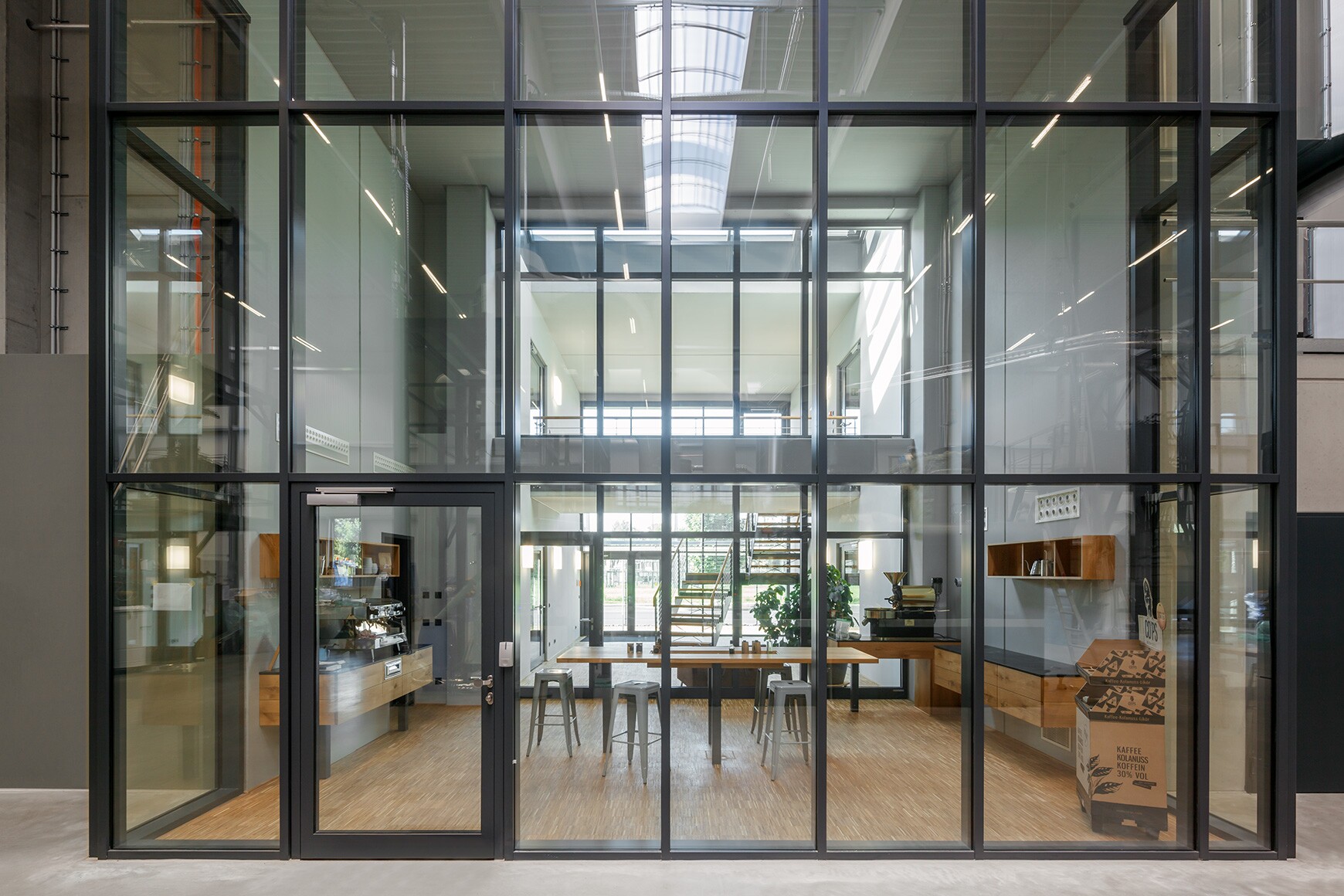 Die Firma Kaffee Braun vereint klassische Manufaktur-Röstung und Dienstleistung in Sachen Röstkaffee für Großverbraucher – und zwar seit 35 Jahren unter einem Dach. Das vorstehende Bürogebäude wurde mit Architekturbeton-Sandwichfassade in gestrahlter Oberfläche ausgeführt. Insgesamt hat es eine Nutzfläche von 1.900 m². Kernstück des sehr repräsentativen Objekts bildet das „Aquarium“: Der knapp 40 m² große Vertriebs- und Verkostungsraum erstreckt sich über zwei Etagen und stellt das Bindeglied zwischen Bürogebäude und Produktionshalle dar. Er wird seitlich durch 6,8 m hohe Sichtbetonwände begrenzt. Eine Pfosten-Riegel-Fassade zur Produktion hin eröffnet einen direkten Panoramablick in die Produktion.