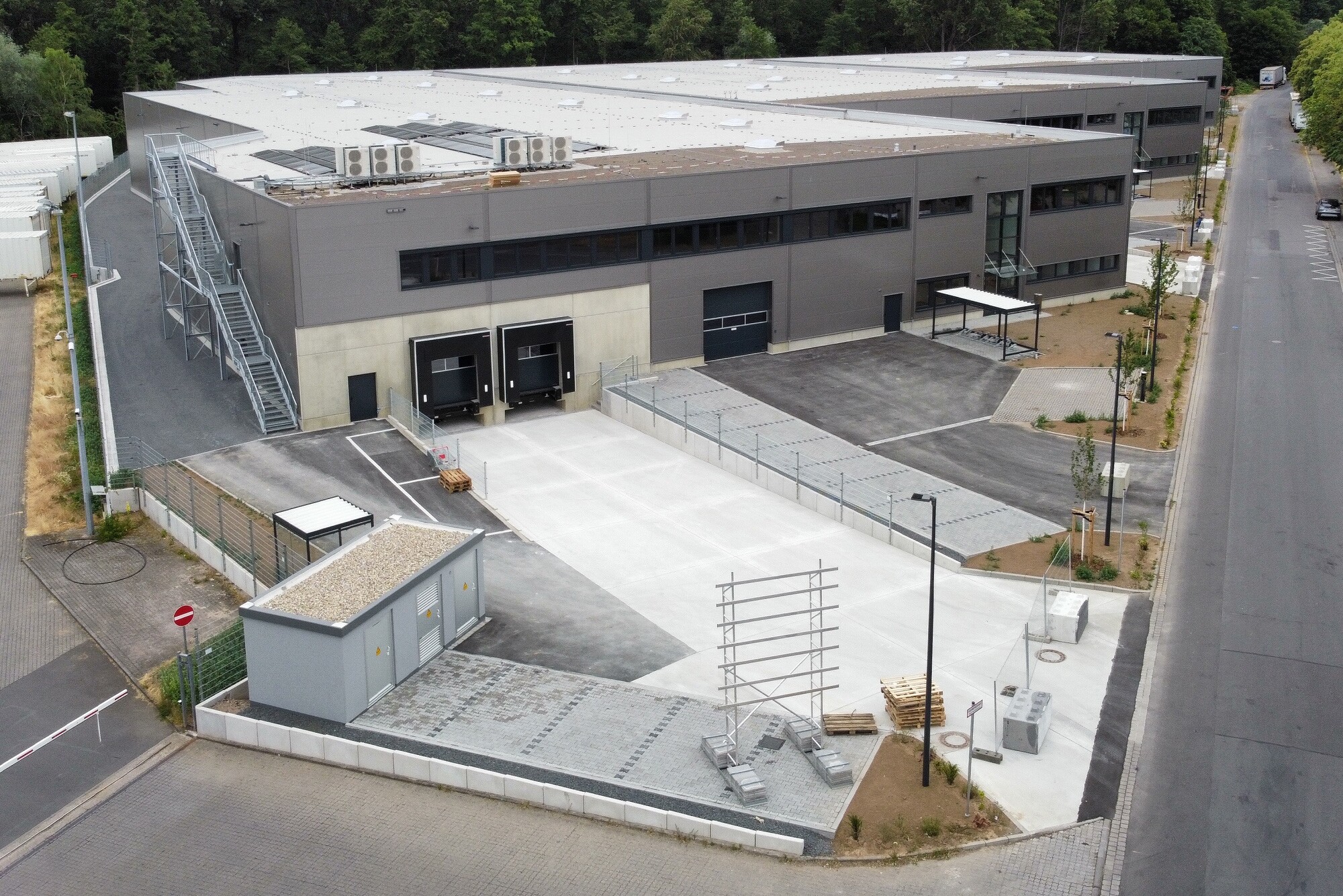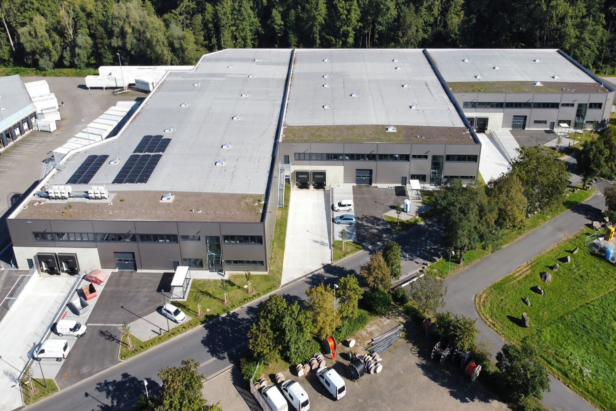 Nach verschiedenen Maßnahmen zur Bodenverbesserung sowie einem großflächigen Bodenaustausch im Bereich von Rigolen, Sedimentationsanlagen und Löschwassertank wurden über 440 Stahlbetonfertigteile sowie 1.500 m² Hohlkörperdecken montiert. Die Fassade besteht aus 100/120 mm Iso-Paneelen. An drei Kopfbauten ist seitlich eine Fassadenbegrünung angepflanzt. Über den Mezzaninbereichen befindet sich zudem ein extensives Gründach. Die Stahlfaserbetonplatte im Hallenbereich ist mit einer Fußbodenheizung ausgestattet, die eine Heiz- und Kühlfunktion besitzt. Eine Photovoltaikanlage versorgt die Wärmepumpe mit Strom. Das Gebäude hat die Auszeichnung DGNB Gold.