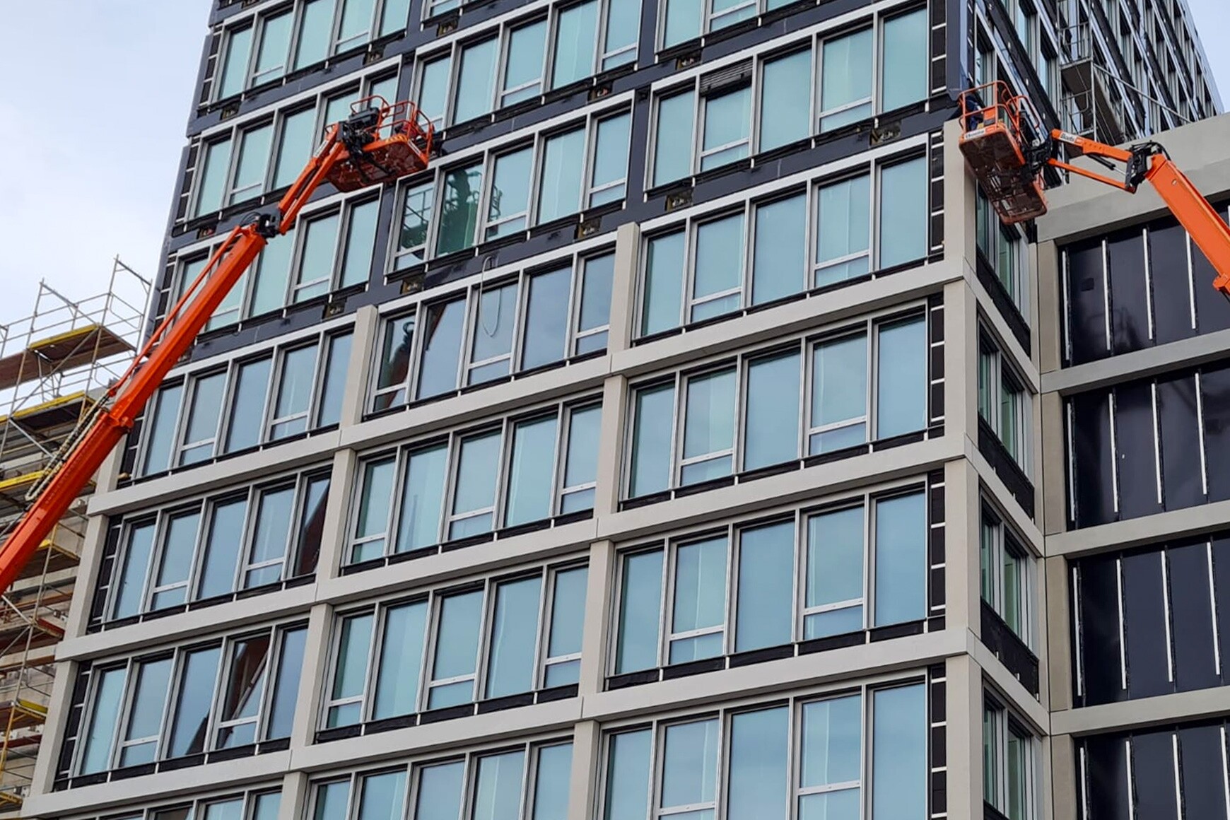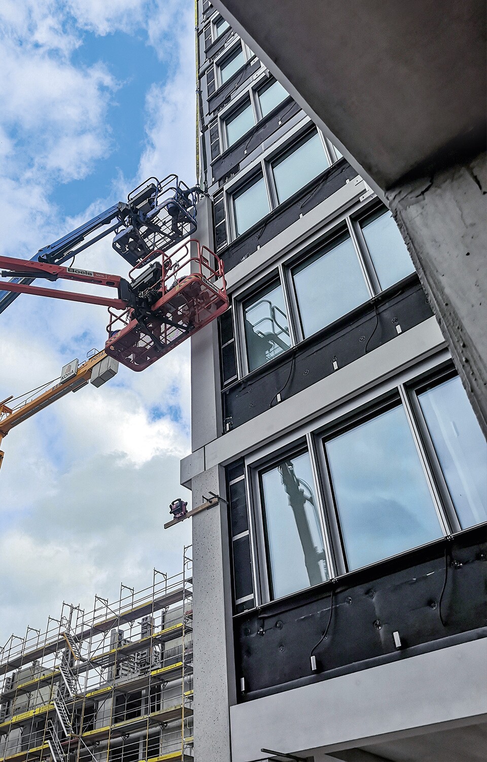 Die Fassaden umfassen rund 12.200 m² Sichtbetonfläche, die sich durch ca. 34 Kilometer scharfe Kantenausbildungen und eine Kombination aus rauen, gestrahlten vertikalen sowie glatten horizontalen Elementen auszeichnen. Um eine durchgehend gleichbleibende Qualität sicherzustellen, wurden 1.600 Tonnen Naturstein aus dem Taunus speziell für die Betonrezeptur gesichert und zwischengelagert. Anspruchsvolle Rahmenbedingungen, wie beengte Platzverhältnisse auf der Baustelle und Elementgewichte von bis zu 23 Tonnen, erfordern größte Sorgfalt bei der in bis zu 57m Höhe stattfindenden Montage.