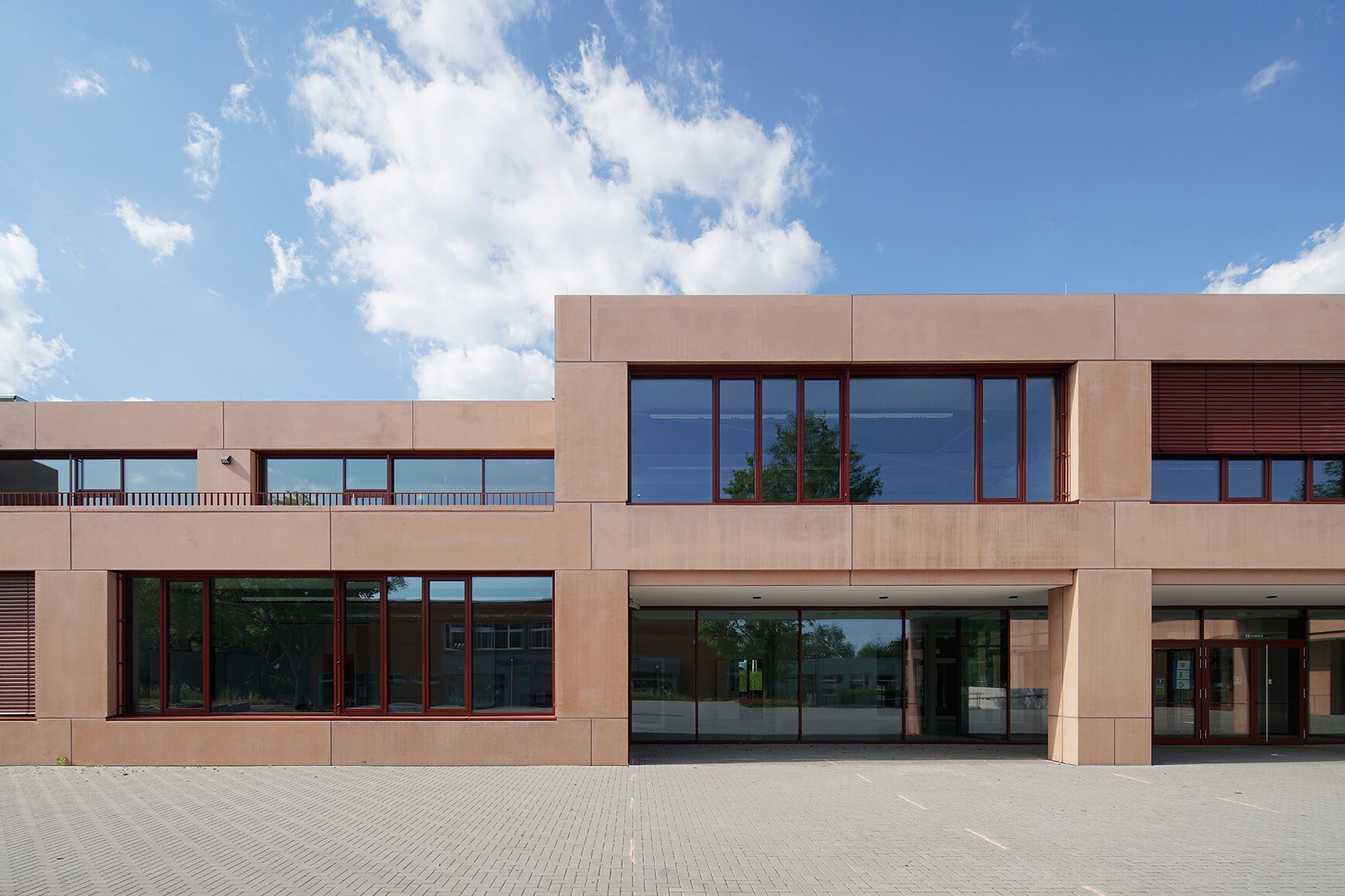 Der zweigeschossige, L-förmige Schulneubau liegt wie ein rötlichbrauner Monolith am nördlichen Ortsrand des Wiesbadener Vorortes Bierstadt. Er übernimmt gemäß seiner Vorbildwirkung und als Ort der Bewusstseinsbildung eine aktive Rolle im Bereich des Klimaschutzes und wird über die Lichthöfe und Atrien natürlich belichtet. Die großflächigen Fensterelemente werden von ca. 300 vorgehängten Betontafeln mit glatter Oberfläche und scharfkantiger Ausbildung umrahmt. Laibungen mit nahezu 40 cm Tiefe und Eckelemente mit 135 cm langen, angeformten Schenkeln unterstreichen die Massivität des Baukörpers.