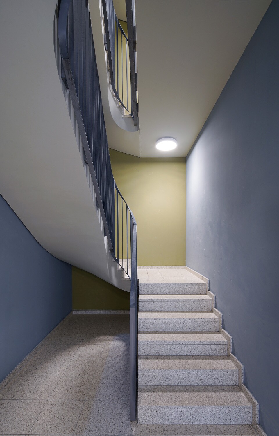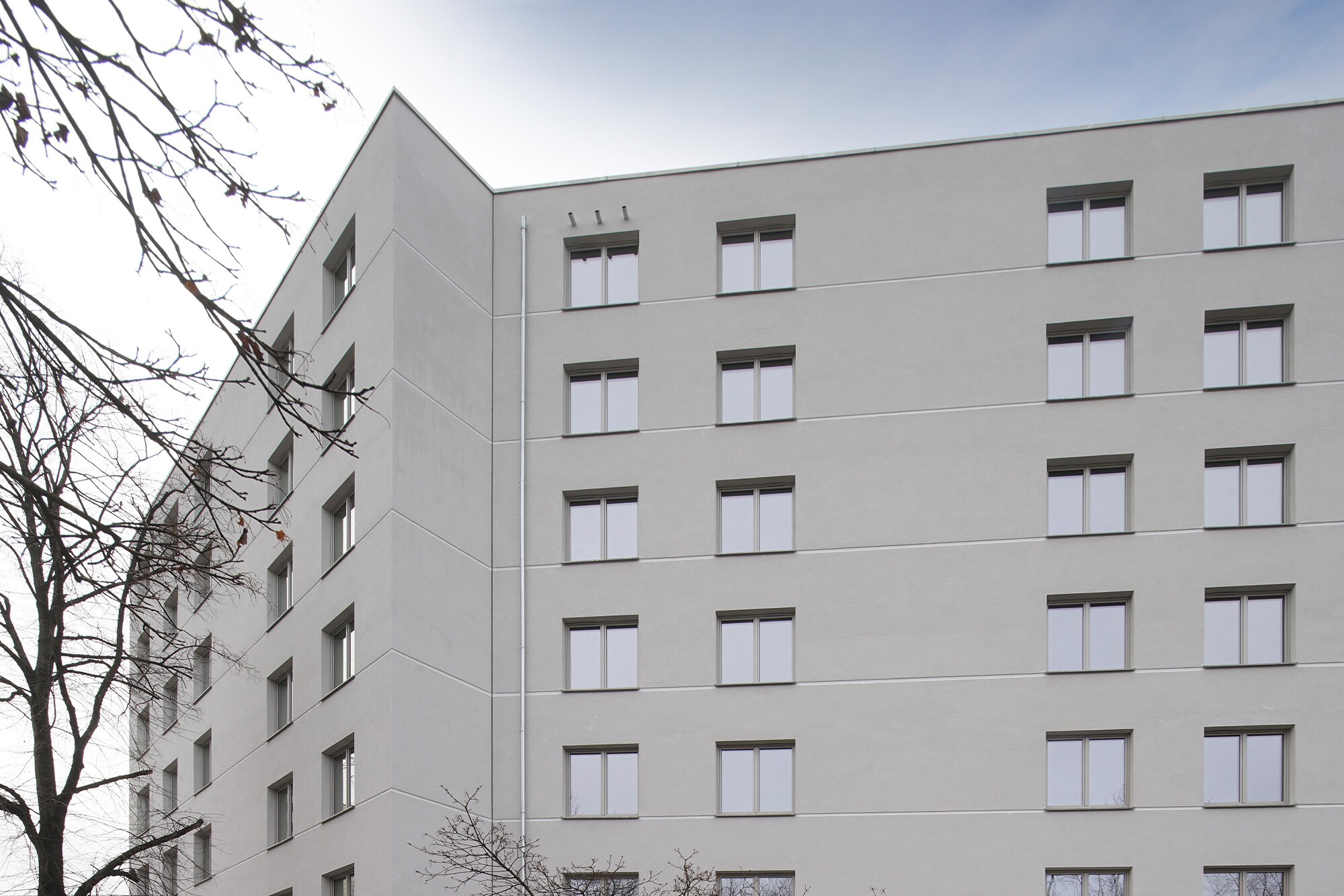 Es handelt sich hier um sozialen Wohnungsbau, der mit Leichtigkeit hohen ästhetischen Ansprüchen gerecht wird. Dazu trägt besonders die Vorhangfassade aus Sichtbetonelementen bei. Die darüber aufgehende hochwertige Kratzputzfassade ist geschossweise durch umlaufende Bänder gegliedert.