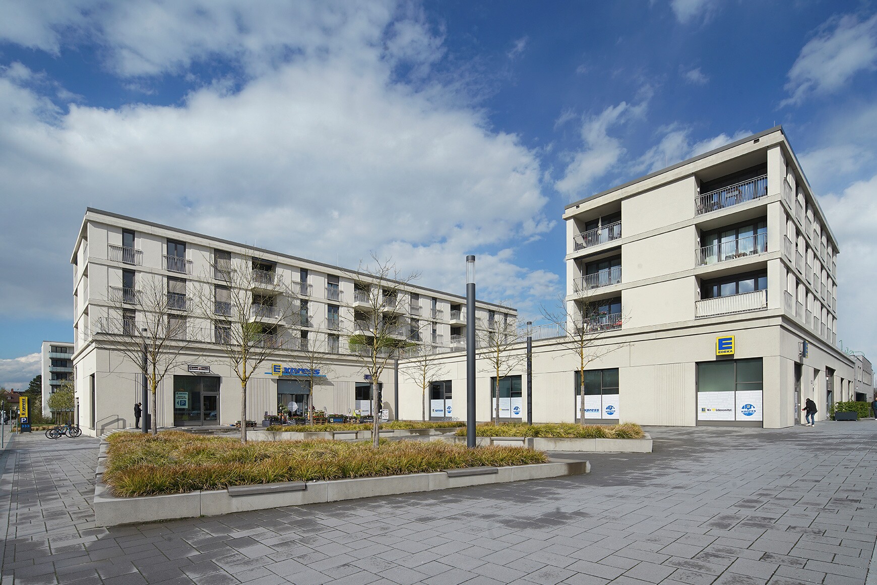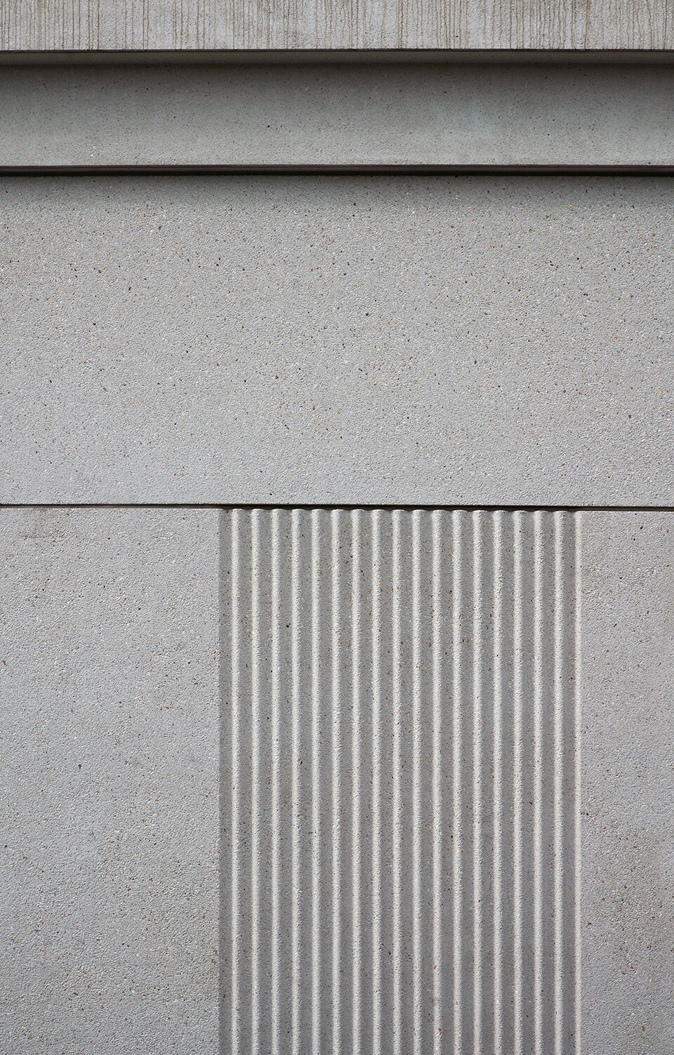Im historischen Bezirk Altperlbach im Südosten Münchens entstand ein neues Wohngebiet mit einem viergeschossigen Baukörper, dessen Fassaden Putz- und Sichtbetonflächen mit raumhohen Fenstern kombinieren. Die im Sockelbereich ausgeführte Fassade aus zementgrauen Betonfertigteilen mit gestrahlter Oberfläche wird in Form von geschossweise umlaufenden Gesimsbändern und als Attika fortgeführt. Obwohl die Bänder nur 36 cm hoch sind, konnten sie, trotz ihrer Kopflastigkeit, mit Hängezugankern wirtschaftlich montiert werden. Die Vorhangfassaden im EG erhielten in Teilbereichen senkrechte Auskehlungen, ähnlich der Kannelierung an griechischen Säulen. Insgesamt kamen knapp 200 Architekturbetonelemente zur Ausführung.