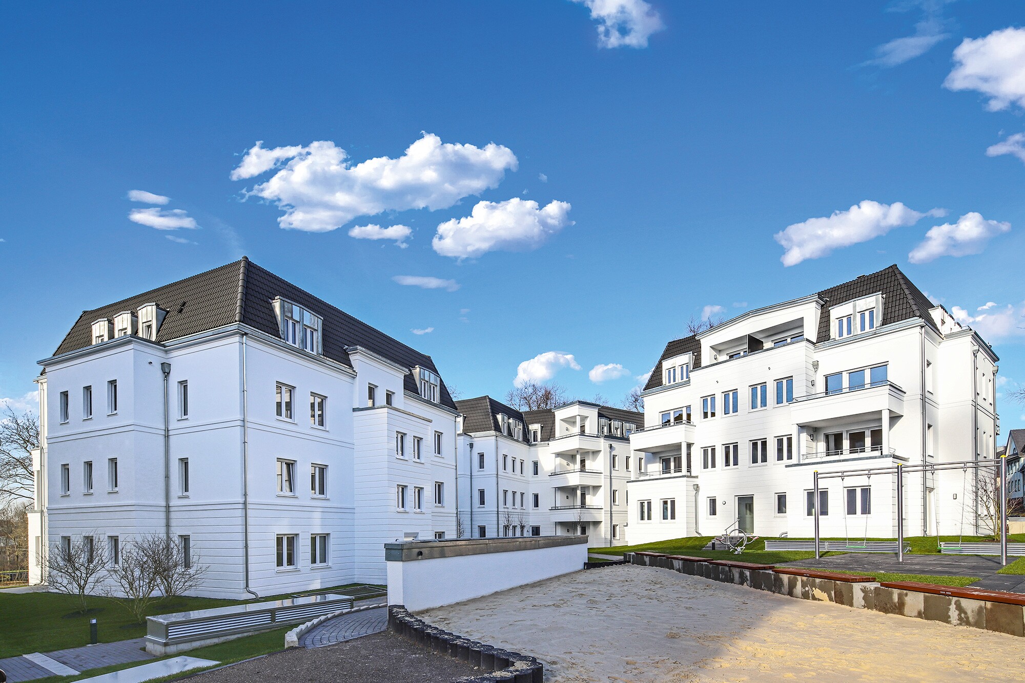Die Fassaden des neuen Dichterviertels sind an den Stil der Altbaufassaden der umliegenden Häuser angelehnt. Mit Sprossenfenstern, Gesimsen und Faschen sowie Mansardendächern fügt es sich nahtlos in die Umgebung ein. Dreßler Bau hat den erweiterten Rohbau inkl. der Entwässerungsarbeiten unter- und außerhalb des Gebäudes ausgeführt. Der Standort in einer ehemaligen Bergbauregion machte es erforderlich, das Untergeschoss als WU-Konstruktion zu erstellen, um die Gasdichtheit gegen evtl. austretendes Methangas sicherzustellen. In 10 Gebäudekörpern entstanden 84 Miet- und 28 Eigentumswohnungen, 6 Townhouses sowie 101 TG-Stellplätze. Aufgrund von Höhenversprüngen der Decke innerhalb der zweigeschossigen TG ergaben sich Unterzüge von bis zu 3 m Höhe und Raumhöhen im Bereich der Unterzüge bis zu 6 m. Die Kelleraußenwände und alle Decken ab EG wurden als Halbfertigteile errichtet, bei den Wänden kam teilweise Mauerwerk zur Ausführung. Im DG wurden Stahlbetonfertigteilwände von bis zu 5 m Höhe erstellt, die an vielen Stellen dem Verlauf des Mansardendaches folgen mussten. Dadurch waren die Wände trapezförmig, was mit einem erhöhten Schalungsaufwand verbunden war.