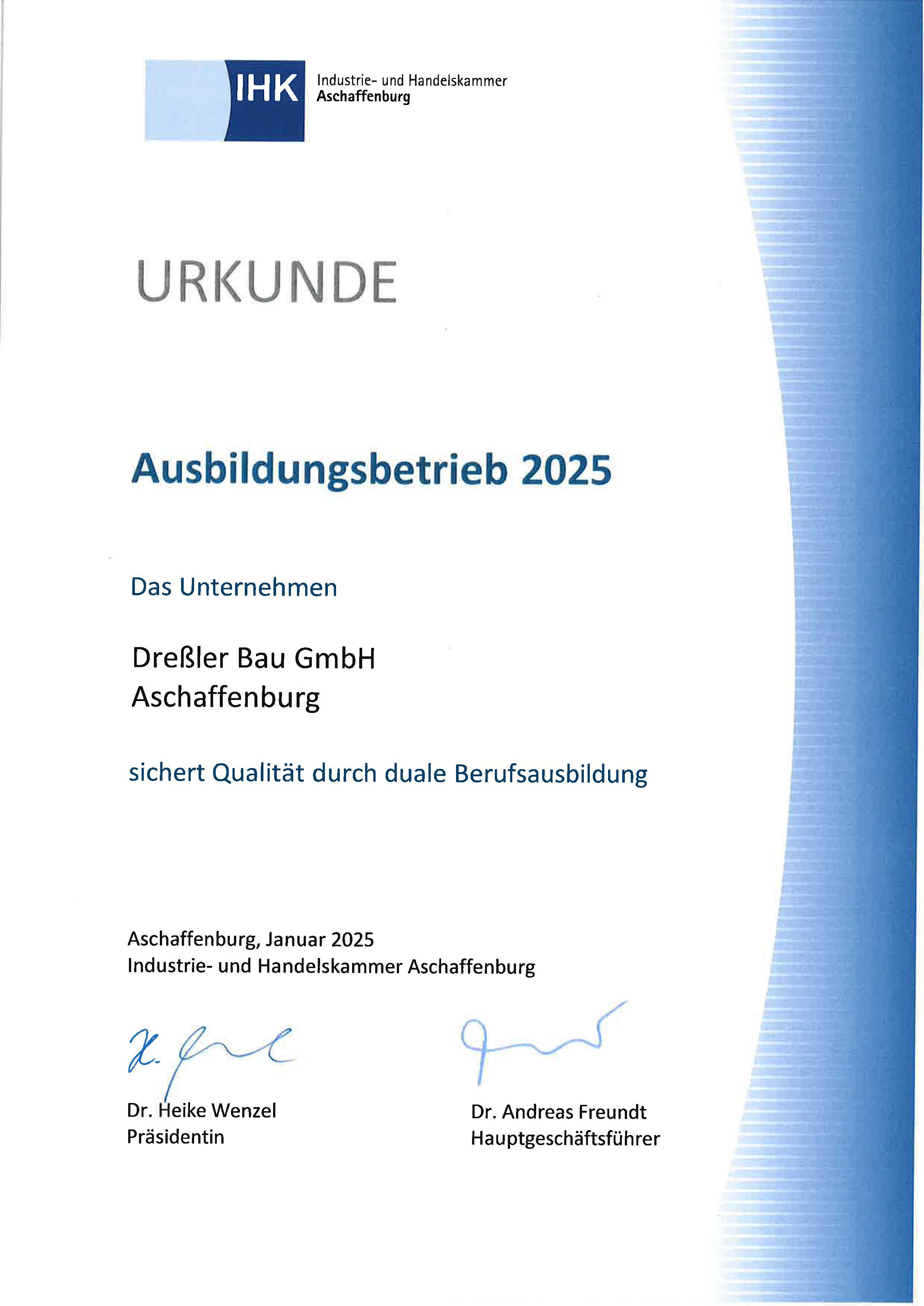 Der Dreßler Bau GmbH wurde durch die IHK Aschaffenburg das Prädikat „Ausbildungsbetrieb 2025“ verliehen.