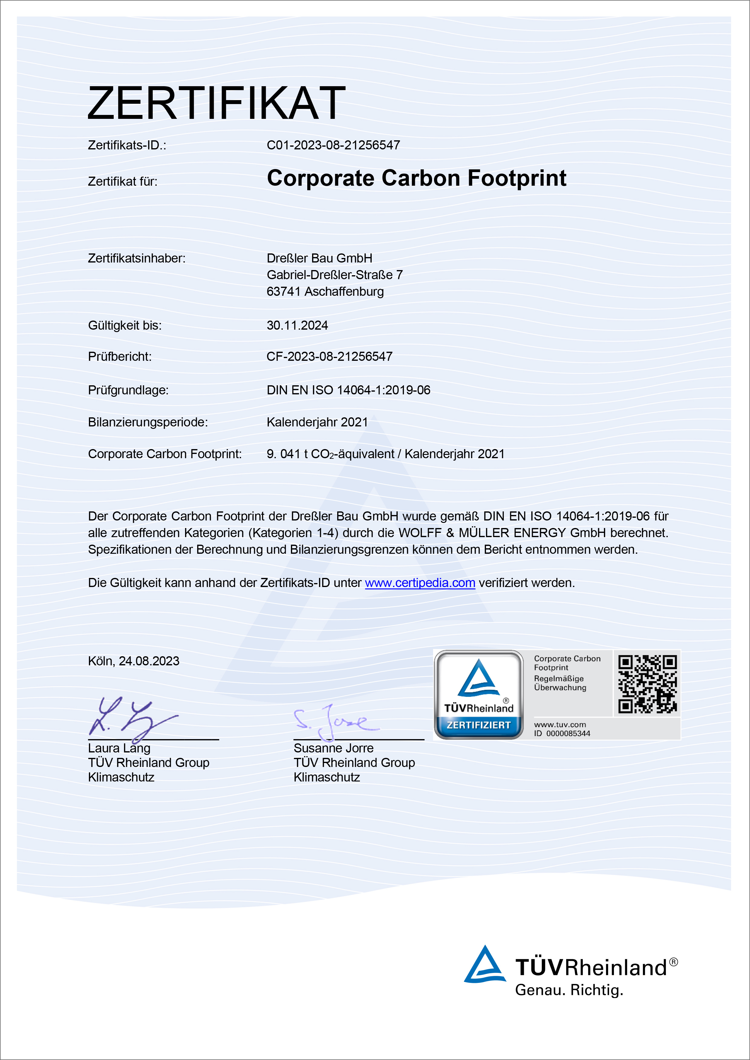 Dreßler Bau besitzt das Zertifikat Corporate Carbon Footprint nach DIN EN ISO 14064-1:2019-06.